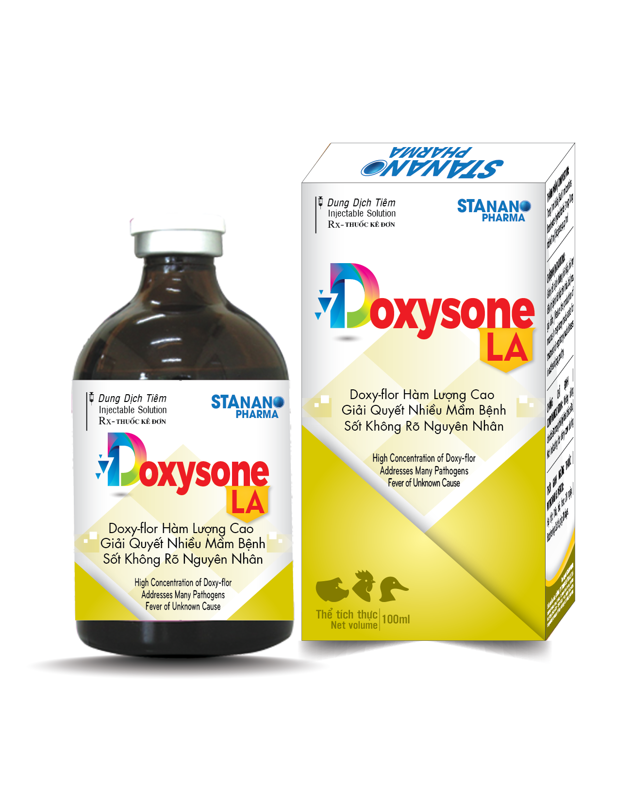 Florfenicol 200 mgm, Doxycycline hyclate 100 mg, Bromhexine hydrochloride 5 mg, Dung môi vđ